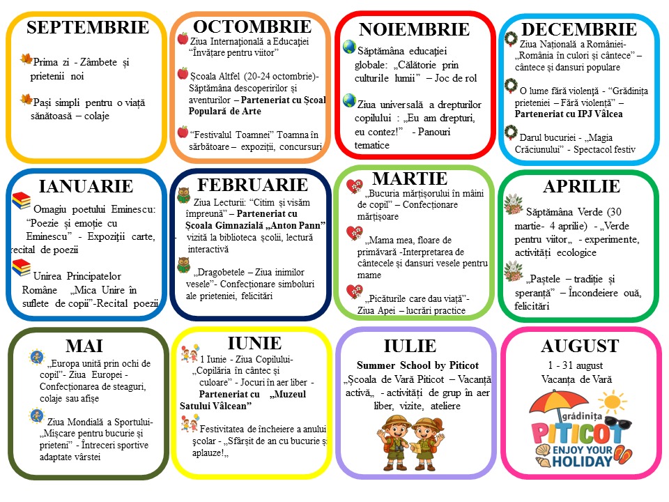 M-am alăturat echipei PITICOT convinsă fiind că este o grădiniță care îmi oferă posibilitatea dezvoltării mele profesionale, în cadrul căreia mă simt binevenită și apreciată, dar și un loc unde copiii învață în cele mai bune condiții.